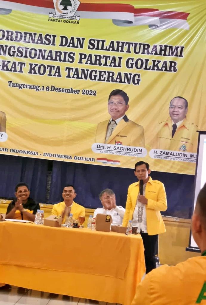“Di tengah-tengah kita juga telah hadir sahabat saya, Sanusi yang kini telah resmi menjadi fungsionaris DPP Partai Golkar,” kata Sachrudin, Ketua DPD Partai Golkar Kota Tangerang.
