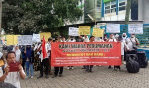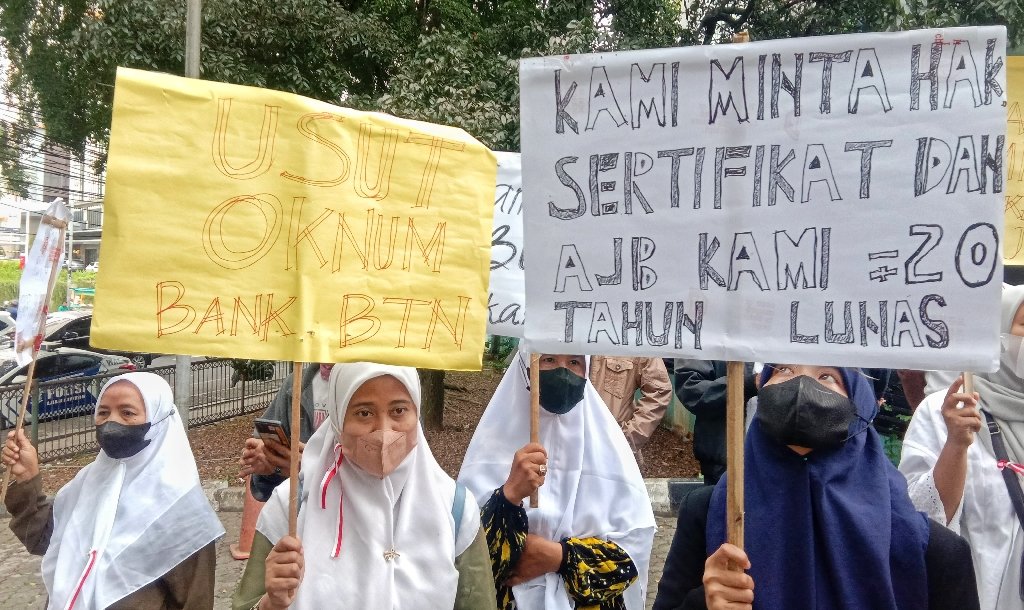 Pasalnya, dengan membawa beragam alat peraga puluhan warga menuntut atas hak kepada pihak PT BTN Tbk untuk segera mengeluarkan sertifikat atas KPR yang sudah mereka lunasi tanpa biaya apapun.