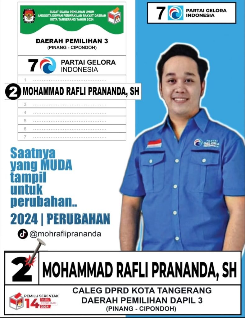 Sebagai Caleg Dewan Perwakilan Rakyat Daerah (DPRD) Kota Tangerang, Mohamad Rafli Pranada pun siap berkompetisi menahkodai Partai Gelora dengan nomor urut 2 di Dapil 3 Pinang – Cipondoh Kota Tangerang.
