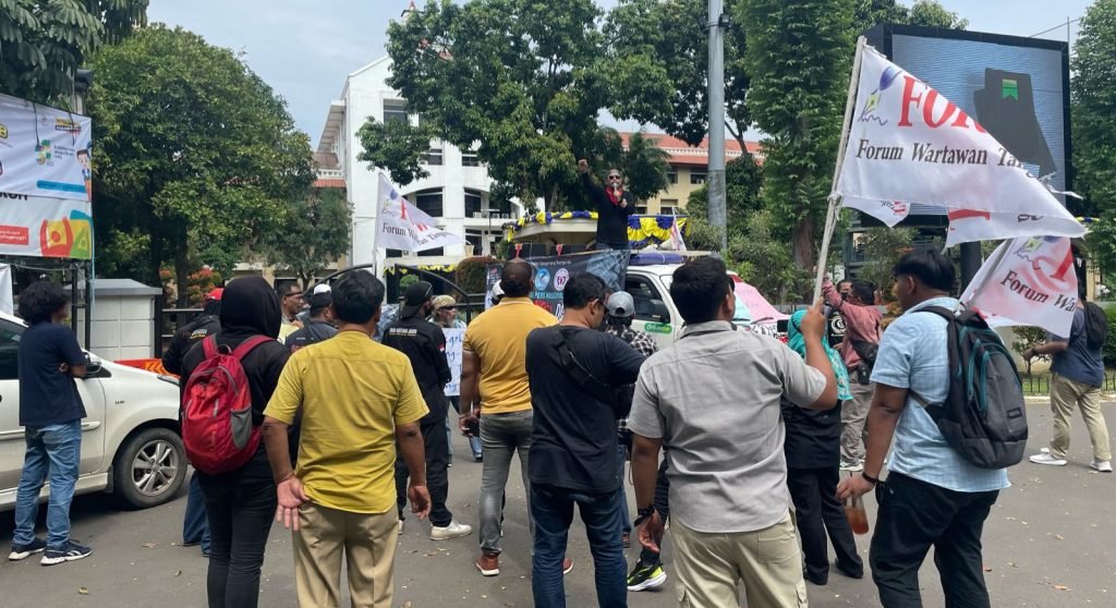 TANGERANG, BINGKAIKOTA.COM – Puluhan wartawan yang mengatasnamakan Front Jurnalis Tangerang Bergerak, yaitu Forum Wartawan Tangerang (FORWAT), Komunitas Jurnalis Kompeten (KJK) dan Forum Wartawan Jaya Indonesia (FWJI,) Korwil Tangkot mengerduk Kantor Satpol PP Kota Tangerang, Selasa (26/2/2024).