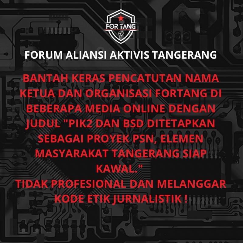 TANGERANG, BINGKAIKOTA.COM – Berita yang mencatut nama oraganisasi dengan judul “PIK 2 dan BSD di tetapkan sebagai PSN, Elemen Masyarakat Tangerang Siap Kawal!,” yang telah tayang sejak tanggal 22 Mei 2024. Ketua organisasi Forum Aliansi Aktivis Tangerang (ForTang), Taher Jalalulael membantah isi berita tersebut
