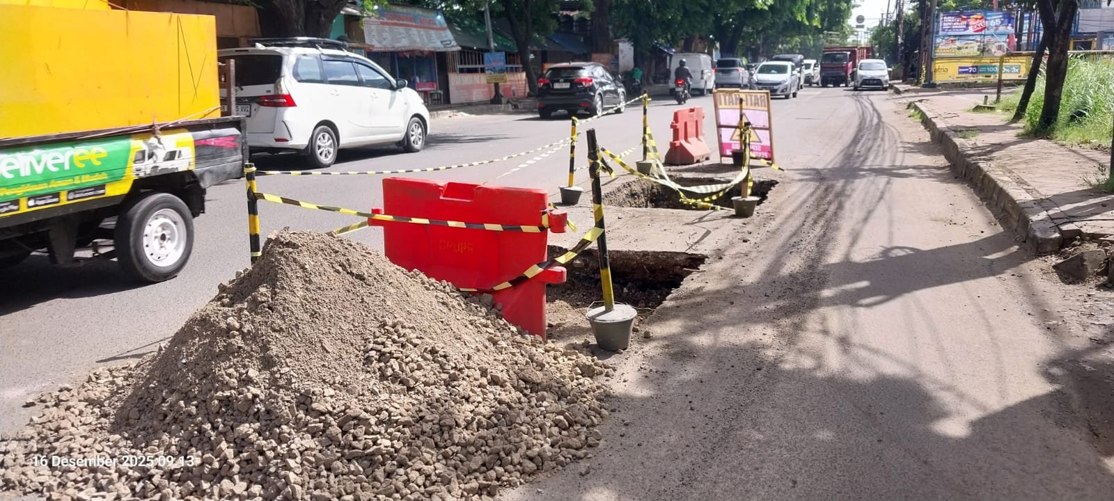 “Parah banget ini sekarang Jalan M.Toha sudah Jalan berlubang di tambah lagi ada galian di tengah jalan yang sudah lama belum di selesaikan pengerjaannya, bikin tambah parah kemacetan” keluhnya.