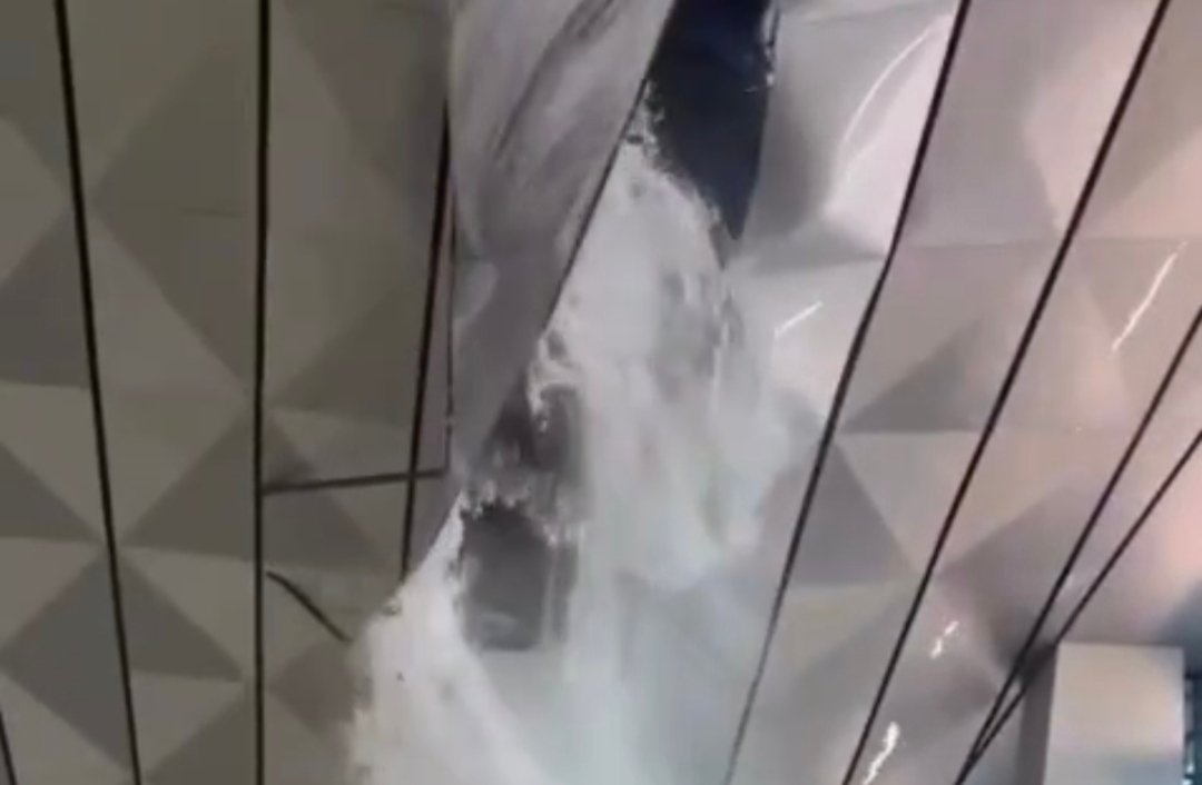 Dalam video berdurasi 30 detik yang diungah Jakarta Terkini menunjukan air keluar dari celah atap kemudian jebol lantaran tidak kuat menahan debit air.