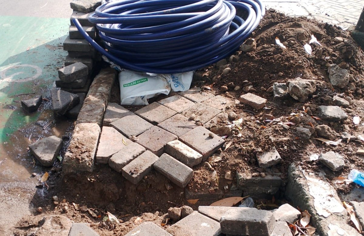 Berdasarkan pantauan di lokasi, terlihat tumpukan tanah bekas galian dan material seperti paving block yang dibongkar dibiarkan tidak tersusun rapi. Bahkan, lubang galian tampak terbuka tanpa pengamanan yang memadai.